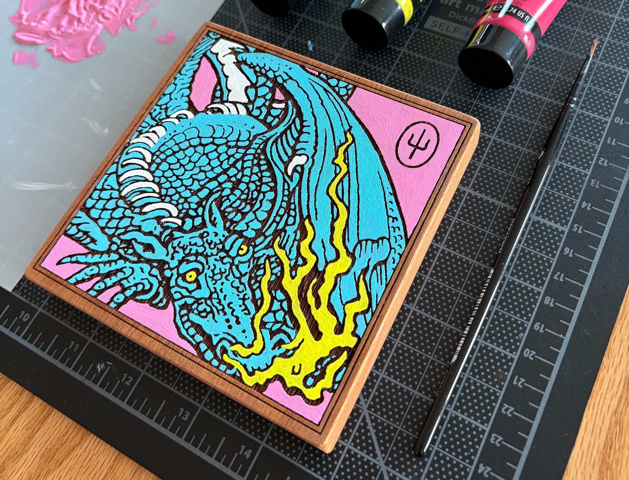 It was then moved into the woodshed where the wooden canvases were cut to size, sanded, stained, and refined in preparation for the laser transfer. From there, the pieces were hand painted with acrylic paint to bring the full designs to life.